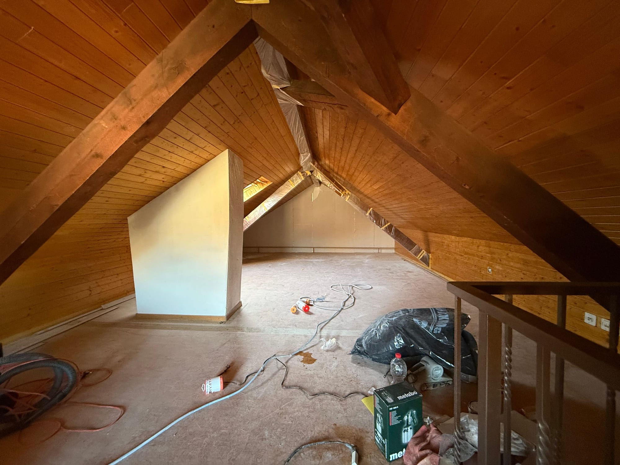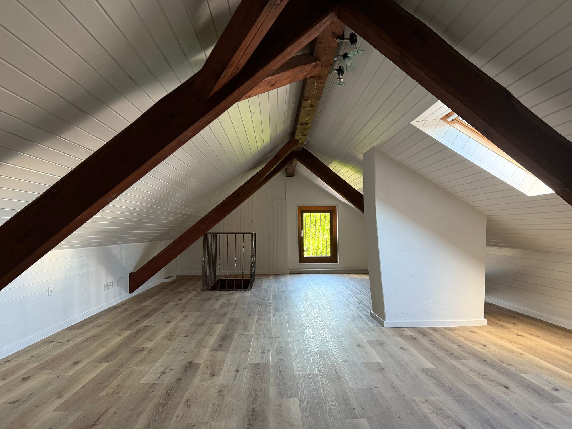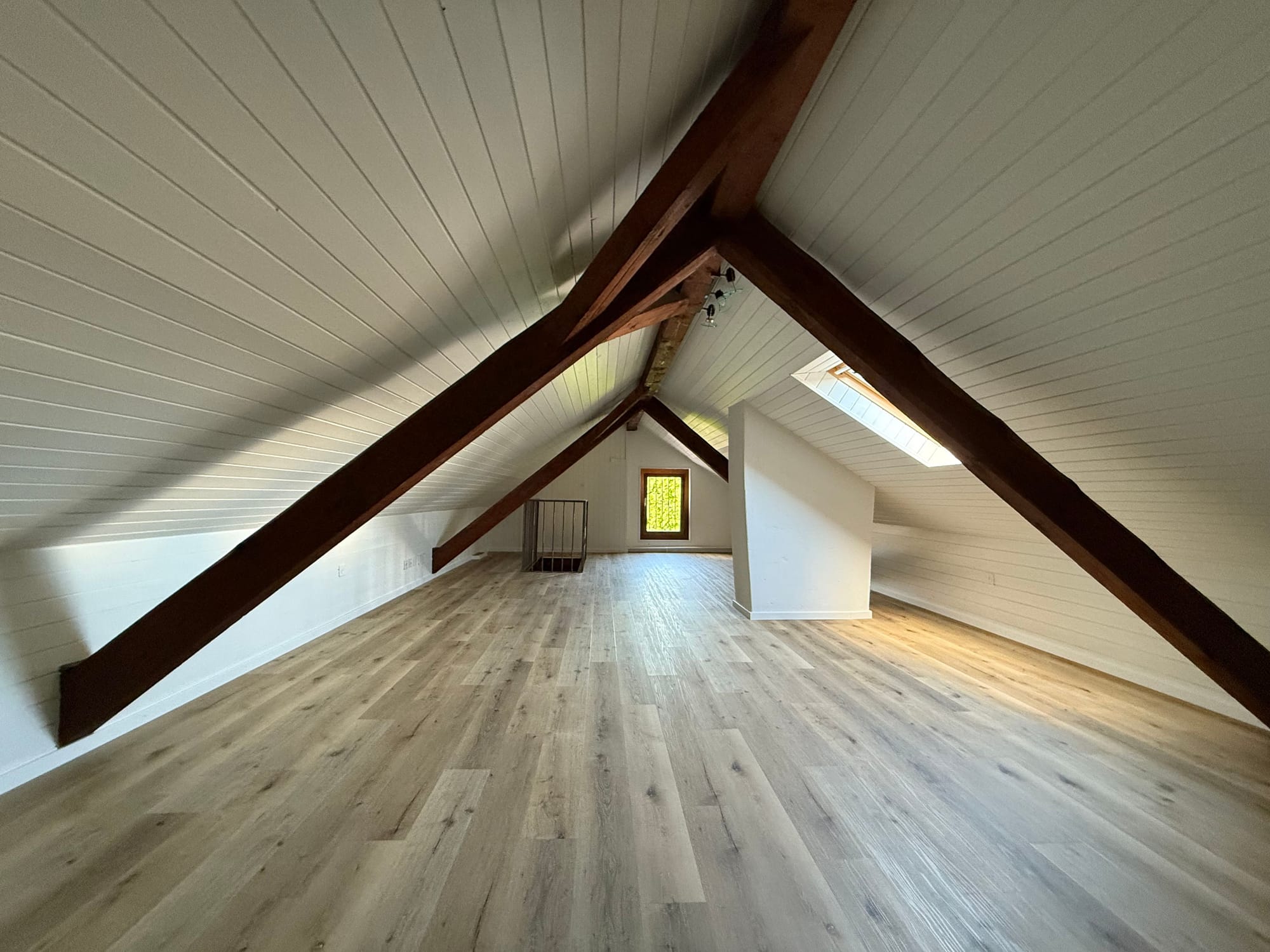 Moderniser une mezzanine, c’est savoir sublimer son caractère tout en lui apportant une touche contemporaine. Les poutres apparentes, mises en valeur par des lambris teintes en blanc, créent une ambiance à la fois chaleureuse et lumineuse.