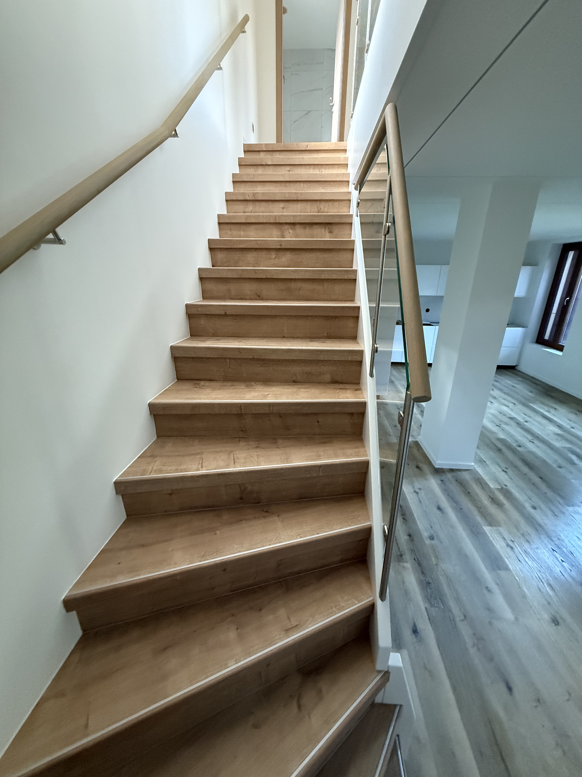 Design unique combinant faux plafonds élégants avec des escaliers innovants et un parquet chaleureux.